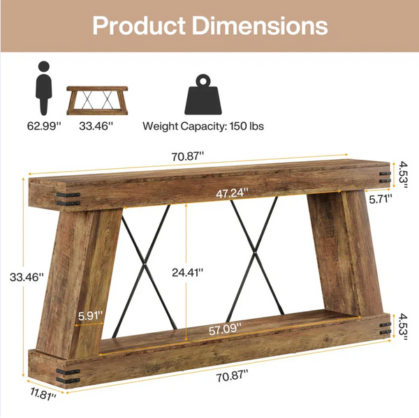 Bring bold, barn-inspired character into your living space with this statement-making 71" console table. A chunky trestle silhouette, angled trapezoidal legs, and dual iron X-cross braces create an unmistakable rustic-industrial presence — perfect behind a sofa, along a hallway, or as an entryway focal point. The weathered barnwood finish and blackened metal accents evoke the warmth of reclaimed timber with the convenience of engineered construction.